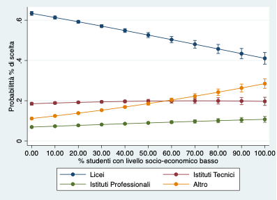 Figura 1 – Probabilità di scelta del tipo di scuola superiore in base alla quota di compagni di classe con basso livello socio-economico nella scuola media frequentata