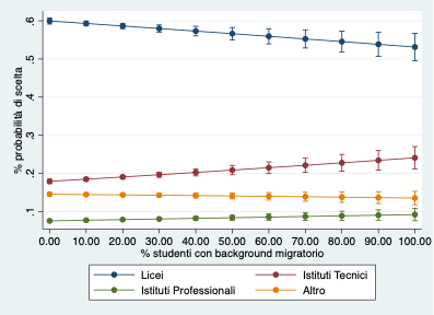 Nota: probabilità stimata in base ad un modello di regressione logistico multinomiale multilivello (studenti, classi, scuole) che tiene in considerazione variabili individuali (status socio-economico, origine migratoria, punteggio nel test INVALSI nella scuola secondaria di I grado, genere e dimensione della classe), effetti fissi a livello di città e quota di studenti con background migratorio nella classe. Numero osservazioni: 65.991.