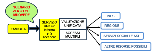 - Invece putroppo né le leggi delega sulle persone con disabilità e anziane, né gli attuali loro decreti delegati approvati, prevedono di muovere verso un servizio unificato locale per ricomporre le valutazioni sulle limitazioni di autonomia e per supportare la famiglia attivando in quel luogo tutte le possibili richieste. Questo perciò resta un obiettivo di riforma da introdurre.